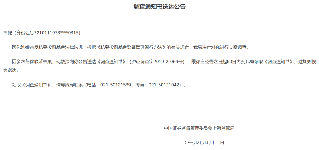 2019年9月,上海证监局公告送达两份调查通知书:韦健、缪宏杰涉嫌违反私募基金管理法规,拟对其立案调查。