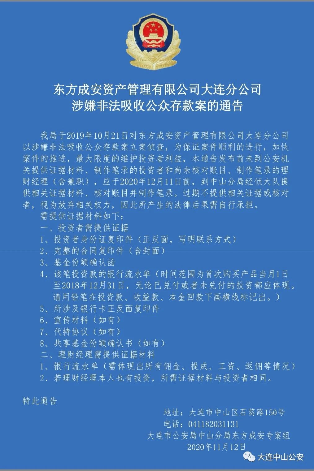 在这份行政处罚之前,刑事立案也在路上。2019年10月,大连市公安局中山分局成立专案组,立案侦查东方成安大连分公司涉嫌“非吸”案。2019年12月,警方“蓝底白字”通告,要求投资者报案。