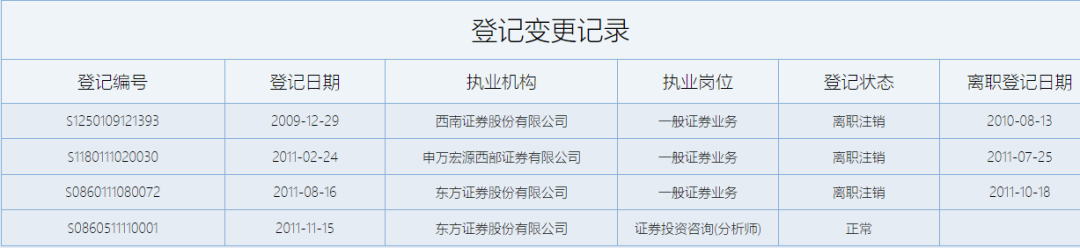 中证协从业人员信息显示,他在2009年12月首次登记执业于西南证券;2011年2月至7月在申万宏源西部短暂执业;2011年8月加入东方证券,同年11月登记为证券分析师,至今已有12年。