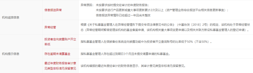 除此之外,还有三条提示信息。投资者定向披露账户开立率低于50%;存在超过到期日3个月且未提交清算申请的私募基金;最近年度经审计的财务信息显示,其审计意见类型非标准无保留意见。