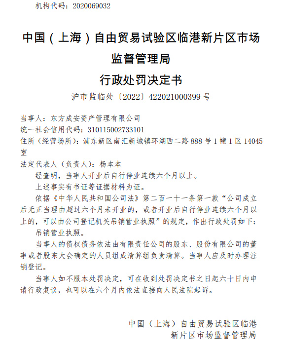 2022年3月,临港新片区市场监督管理局下发行政处罚,拟吊销执照。2022年6月,东方成安工商执照被吊销。