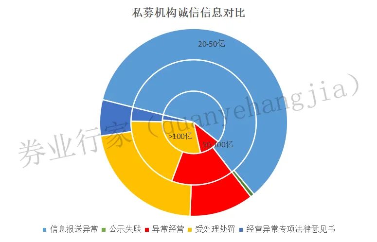 进一步查看规模较大的机构存在”诚信信息“的原因,行家发现“信息报送异常”出现次数较多,涉及21家百亿私募和34家准百亿私募;“受处理处罚”的百亿私募和准百亿私募各有11家;4家百亿私募和9家准百亿私募为“异常经营”,1家百亿私募和2家准百亿私募则是“经营异常专项法律意见书”。