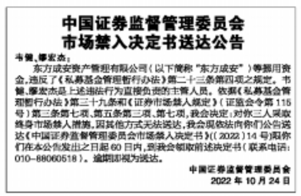 监管调查的内容不详,行家只查到一则来自《上海证券报》的“豆腐块”,日期为2022年10月24日。因东方成安挪用资金,证监会公告送达对韦健、缪宏杰的终身禁入决定。而这里提到的“你三人”,不确定还有谁。