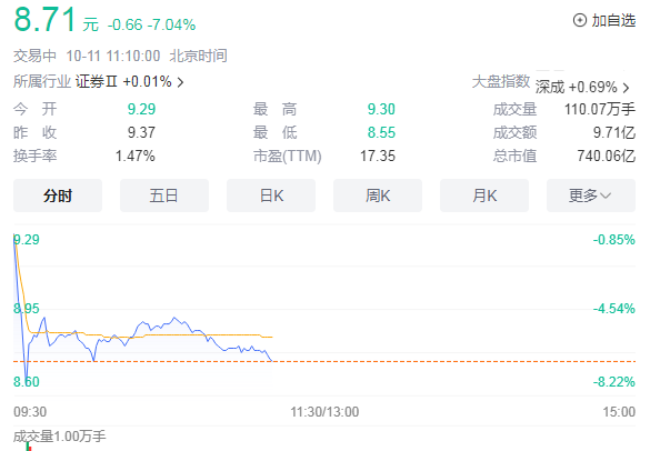 10月11日,东方证券低开低走,一度跌超8%。截至发稿,该股跌幅收窄至7.04%,报8.71元。