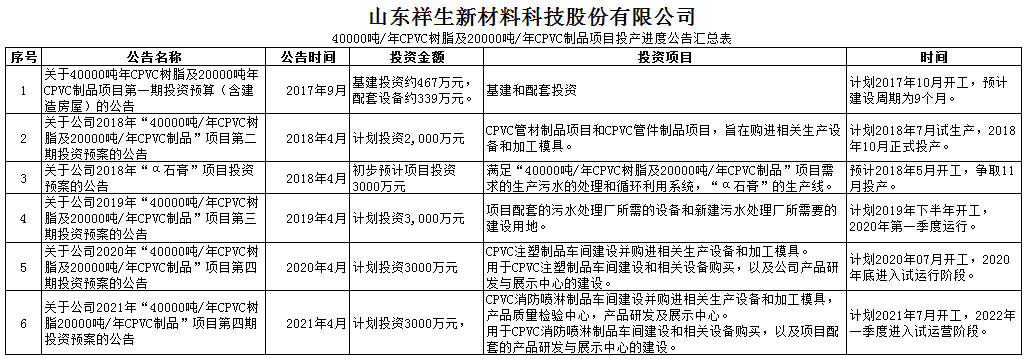 发行人作为目前仍在新三板挂牌的企业,经估值之家查询和整理发行人新三板挂牌期间关于“40,000吨/年CPVC树脂及20,000吨年CPVC制品项目”的相关公告信息,关于该项目的股转系统的所有公告,具体见下表所示: