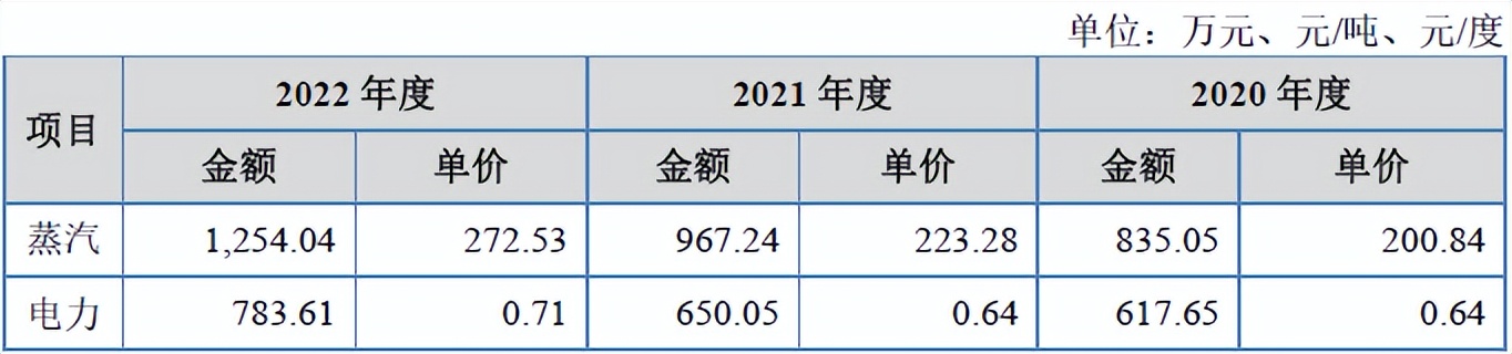 略显诡异的是,发行人披露的上表能耗数据,并没有具体的数量数据,只有单价和金额,为何?但我们从上表过简单计算可知,发行个2020年-2022年蒸汽耗用量分别为:4.15万吨、4.33万吨、4.60万吨;2020年-2022年电力耗用量分别为:965.08万度、1,015.70万度、1,103.68万度。
