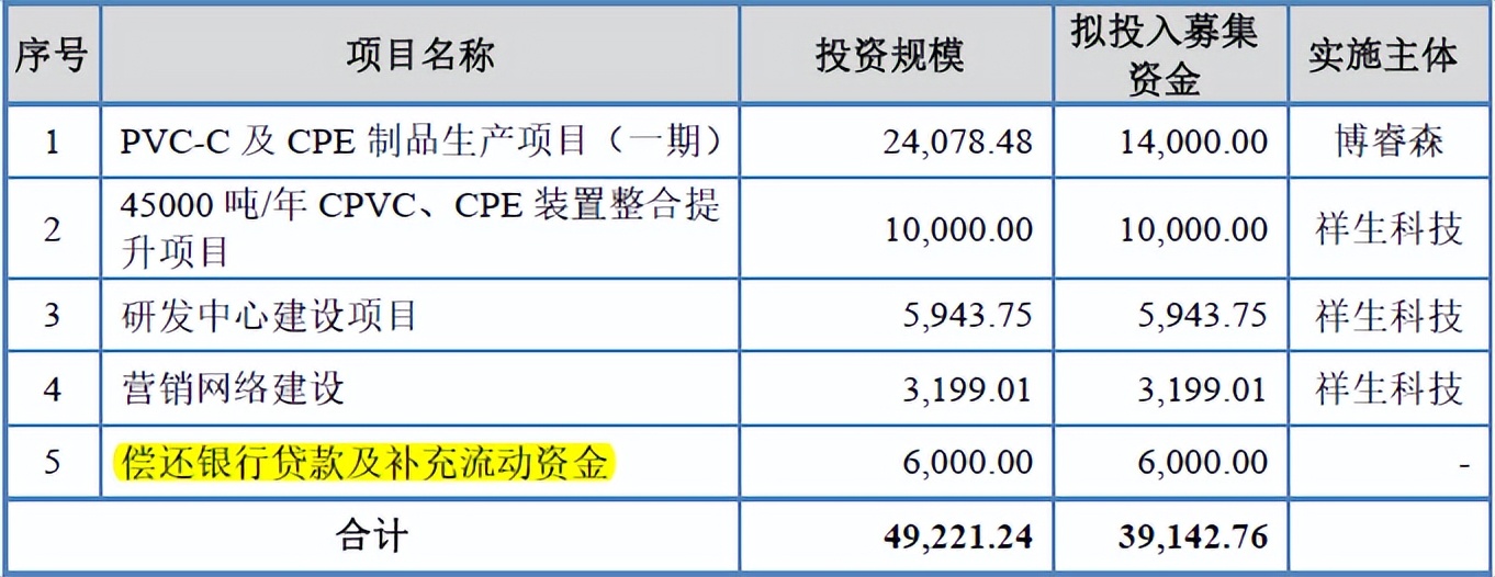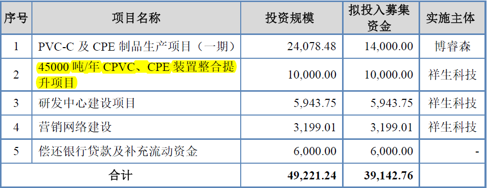 上表第二个项目为“45,000吨/年CPVC、CPE装置整合提升项目”,招股书中就该项目实施的部分原因解释为:“公司现有的生产设备比较落后,部分设备性能已经达不到生产工艺的要求,部分设备陈旧、自动化程度不高,严重影响生产效率。本项目将通过购置先进的生产设备,提高公司的生产自动化水平,实现精益生产。”