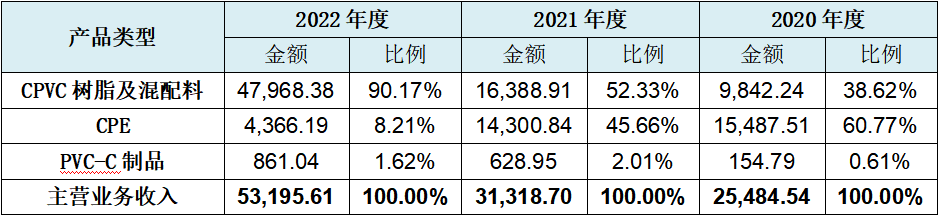 从上表我们可以看到,占发行人收入比较大的依次为氯化聚氯乙烯(CPVC)、氯化聚乙烯(CPE)相关产品,我们以最近年度2022年占比最高的CPVC树脂为例,进行研究和分析。