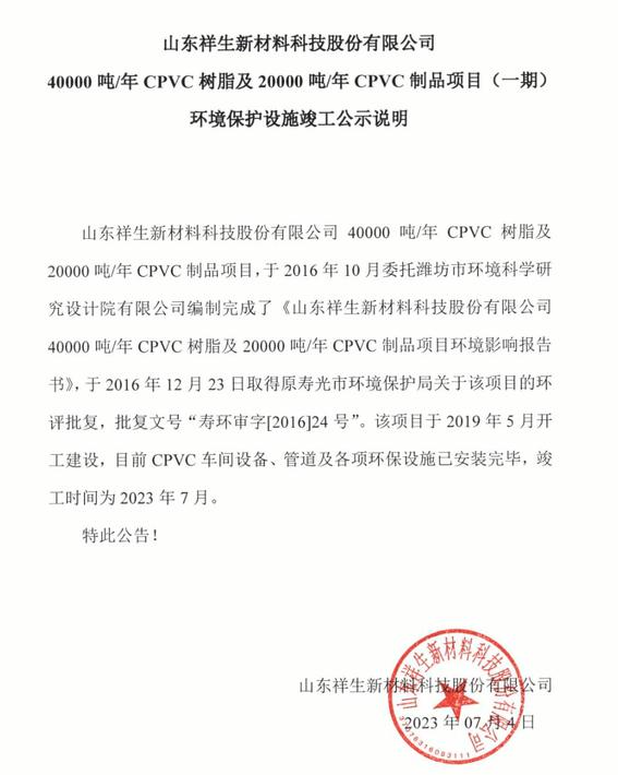 2023年7月发行人在公开渠道公布了,截止到2023年7月CPVC车间设备、管道及各项环保设施已安装完毕,预计竣工时间也为2023年7月的环保设立竣工公示说明。详见下图: