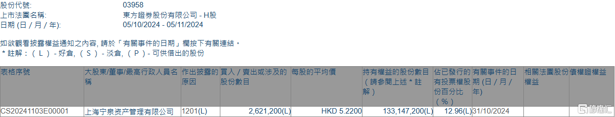 根据联交所最新权益披露资料显示,2024年10月31日,东方证券(03958.HK)遭上海宁泉资产管理有限公司在场内以每股均价5.22港元减持262.12万股,涉资约1368.27万港元。