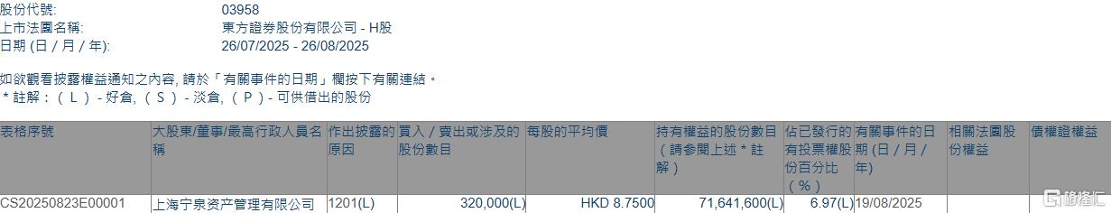 格隆汇8月26日丨根据联交所最新权益披露资料显示,2025年8月19日,东方证券(03958.HK)遭上海宁泉资产管理有限公司在场内以每股均价8.75港元减持32万股,涉资约280万港元。