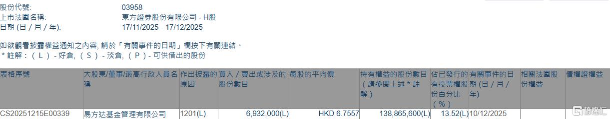根据联交所最新权益披露资料显示,2025年12月10日, 东方证券 (03958.HK)遭 易方达基金 管理有限公司在场内以每股均价6.7557港元减持693.2万股,涉资约4683.05万港元。