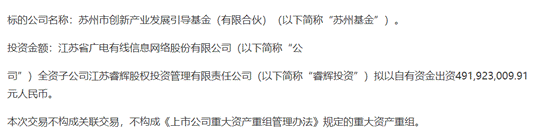 在此背景下,江苏有线或想通过对外投资改善业绩情况。2021年12月31日晚间,江苏有线发布《关于全资子公司对外投资的公告》,江苏有线全资子公司江苏睿辉股权投资管理有限责任公司(以下简称:睿辉投资)拟受让苏州青圭投资管理有限公司(以下简称:苏州青圭)持有的5.13亿元实缴出资对应的苏州市创新产业发展引导基金(有限合伙)(以下简称:苏州基金)合伙财产份额,转让价款4.92亿元。睿辉投资受让该合伙财产份额完成后,占苏州基金实缴资本比例的6.6757%。