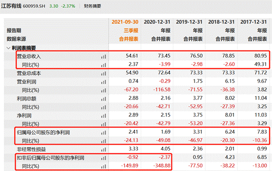 在2021年前三季度“增收不增利”之前,江苏有线已连续三年“营收净利双降”,2020年扣非后归母净利润已亏损。Wind数据显示,2017年-2020年江苏有线营业收入分别为80.95亿元、78.85亿元、76.50亿元和73.45亿元,同比增速分别为49.31%、-2.60%、-2.98%和-3.99%;同期归母净利润分别为7.83亿元、6.24亿元、3.31亿元、1.69亿元和2.41亿元,同比增速分别为--10.36%、-20.30%、-46.97%和-49.08%;其中2020年和2021年前三季度扣非后归母净利润分别为-2.37亿元和-0.92亿元。