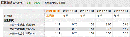 近几年江苏有线营收净利下降或还与其盈利能力下降有关,Wind数据显示,2017年-2020年及2021年前三季度,江苏有线加权净资产收益率分别为5.95%、3.72%、1.54%、0.78%和1.11%。