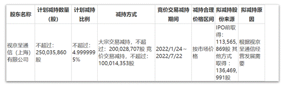 日前,江苏省广电有线信息网络股份有限公司(以下简称:江苏有线,600959.SH)发布公告称,公司股东视京呈通信(上海)有限公司(原名“中信国安通信有限公司”,现更名为“视京呈通信(上海)有限公司”,以下简称:视京呈通信)拟通过大宗交易和集中竞价方式,减持其持有公司股份总数不超过25003.59万股。