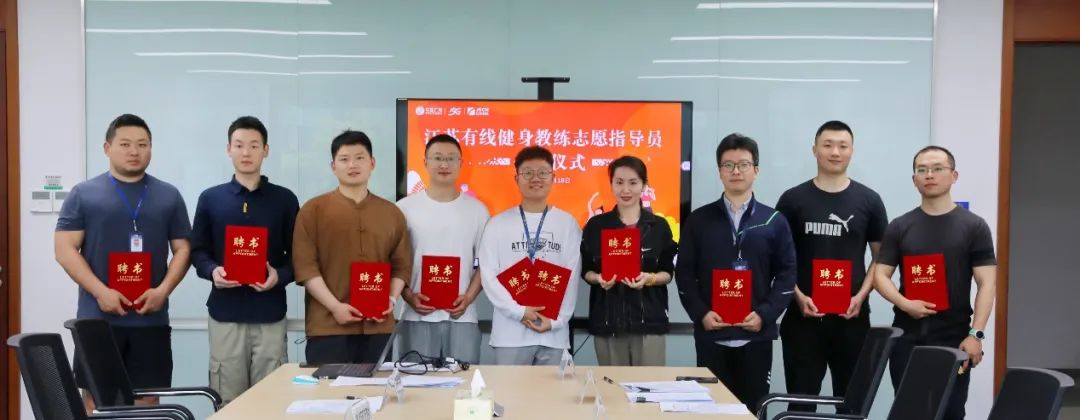 4月18日,由江苏有线工会组织的健身教练志愿指导队正式成立。公司党委办公室主任叶亚涛、纪委办公室主任邢亚彬、工会专职副主席陈枫以及相关部门领导为12位受聘教练颁发了聘书。
