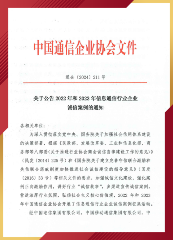 公司入选信息通信行业企业诚信案例名单