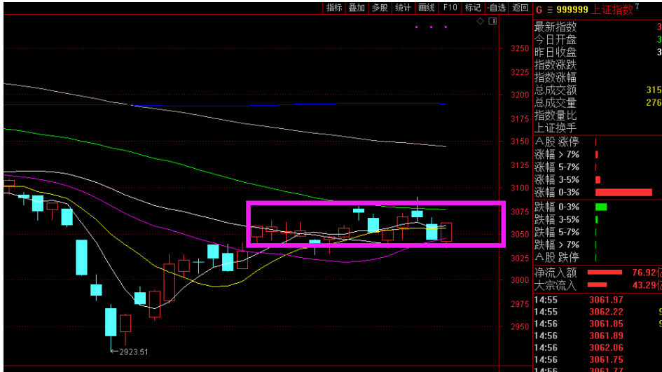 大跌之后,今天市场展开了修复,三大指数基本都是反弹的,创业板则反弹的最弱的,可以看到这里的反弹也并没有放量,而是缩量反弹,说明还是存量资金的博弈!昨天也说过,市场的核心是3020-3280这个箱体之内运行,所以前几天的冲高回落和今天探底回升都非常正常的状态!明天小心又要冲高回落的状态!