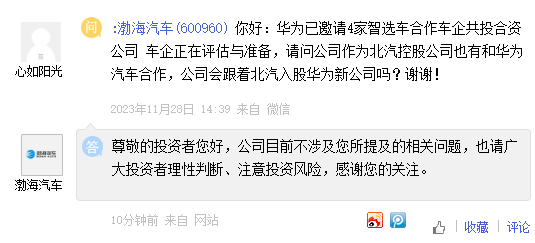 会跟着北汽入股华为新公司吗?渤海汽车:目前不涉及相关问题,呼吁投资者理性判断、注意投资风险