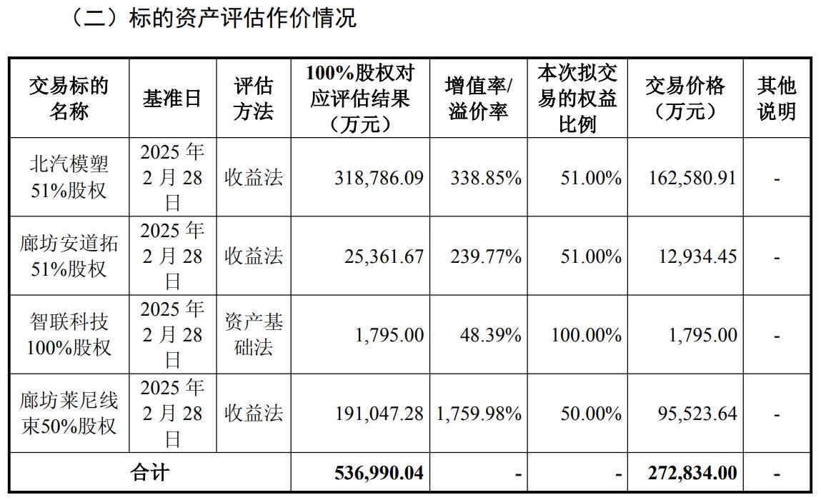 每经记者注意到,在这场交易中,最引人注目的无疑是标的资产的评估溢价。报告书显示,截至评估基准日2025年2月28日,四项交易标的均出现了不同程度的增值。其中,北汽模塑51%股权的交易价格为16.26亿元,评估增值率达338.85%;廊坊安道拓51%股权交易价格为1.29亿元,增值率为239.77%;智联科技100%股权因采用资产基础法评估,交易价格为1795万元,增值率相对较低,为48.39%。