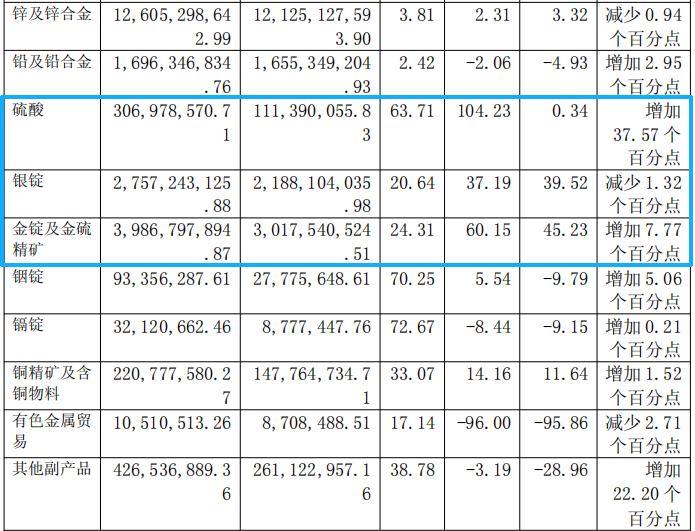 业绩爆发的引擎并不复杂。公司在季报中解释得很清楚——“主要是稀贵金属和硫酸价格上涨,创效增加”。翻看2025年年报可知,公司手中的黄金、白银、硫酸等产品在报告期内价格持续走高。以白银为例,2025年公司银锭营收同比增长37.19%,金锭及金硫精矿营收更是暴增60.15%。2026年一季度,这一趋势显然在加速。