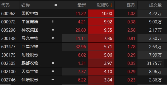A股农林牧渔板块拉升 国投中鲁、中基健康涨停