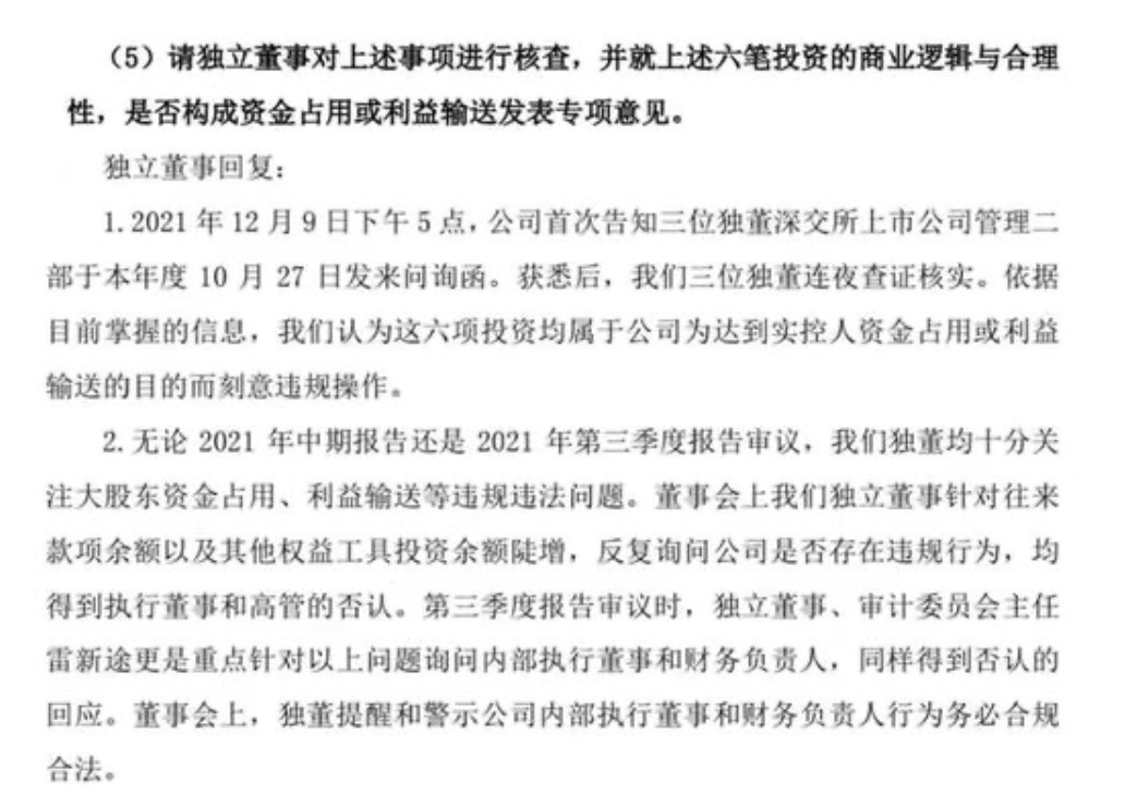 值得一提的是,在美盛文化此次控股股东占用上市公司资金事件中,或慑于康美独董遭遇天价罚款事件的效应,独董们的回复格外亮眼:“获悉后,我们三位独董连夜查证核实。依据目前掌握的信息,我们认为这六项投资均属于公司为达到实控人资金占用或利益输送的目的而刻意违规操作。”