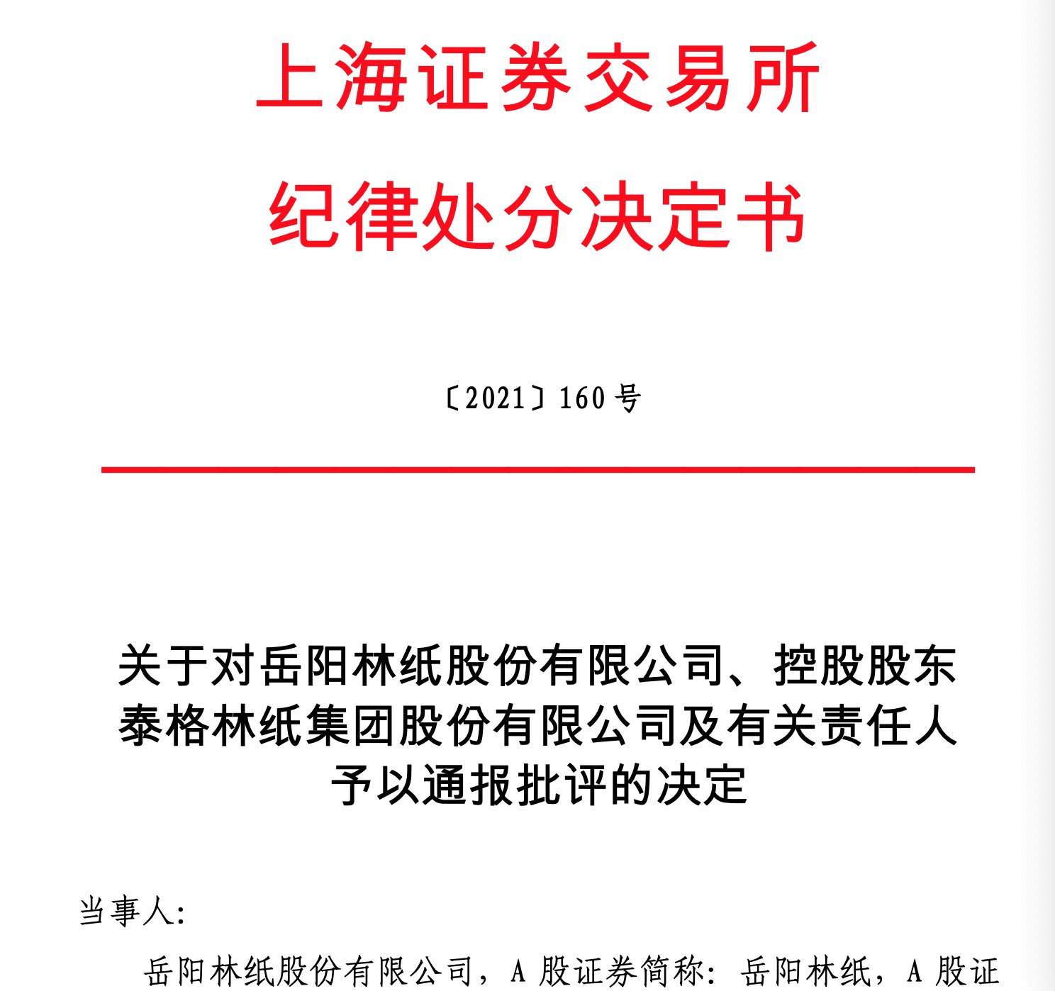 12月16日晚间,岳阳林纸(600963.SH)公告,因控股股东在2020年违规非经营性占用上市公司金额累计30.93亿元,上交所对上市公司、控股股东泰格林纸及有关责任人予以通报批评。公司时任董事长黄欣、叶蒙,时任总经理李战,时任财务总监钟秋生,时任董事会秘书易兰锴均在通报批评的纪律处分名单上。