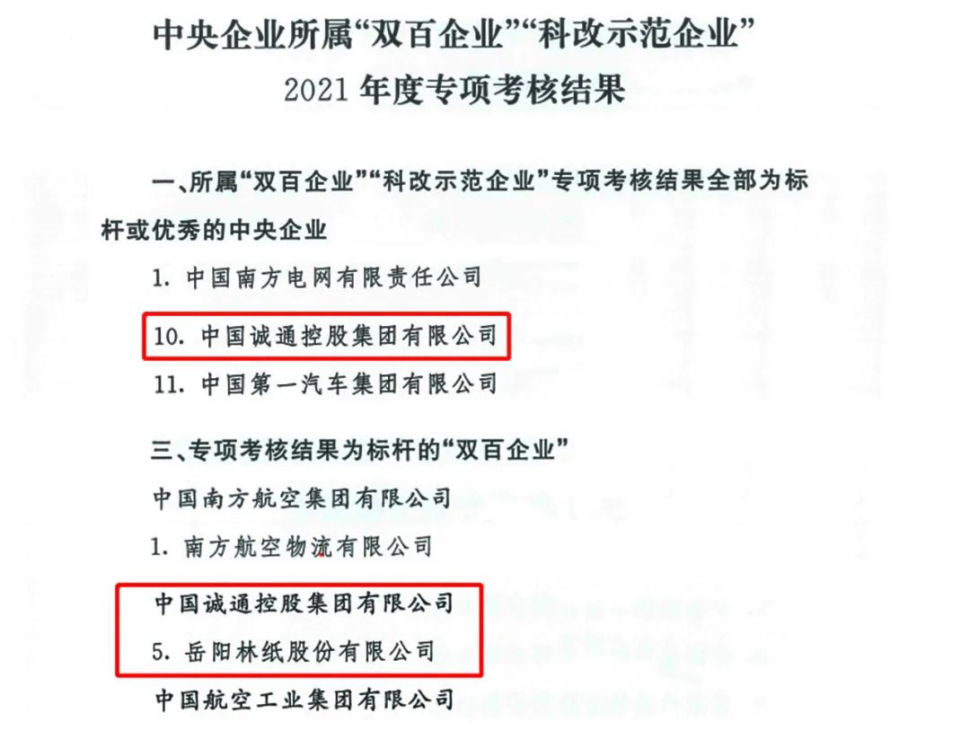 7月3日,国务院国有企业改革领导小组办公室发布《关于印发中央企业所属“双百企业”“科改示范企业”2021年度专项考核结果的通知》,公布中央企业所属“双百企业”“科改示范企业”2021 年度改革创新专项考核情况。中国诚通获所属“双百企业”“科改示范企业”专项考核结果全部为标杆或优秀的中央企业;岳阳林纸以“双百企业”考核第五名优秀成绩,获“标杆”荣誉。