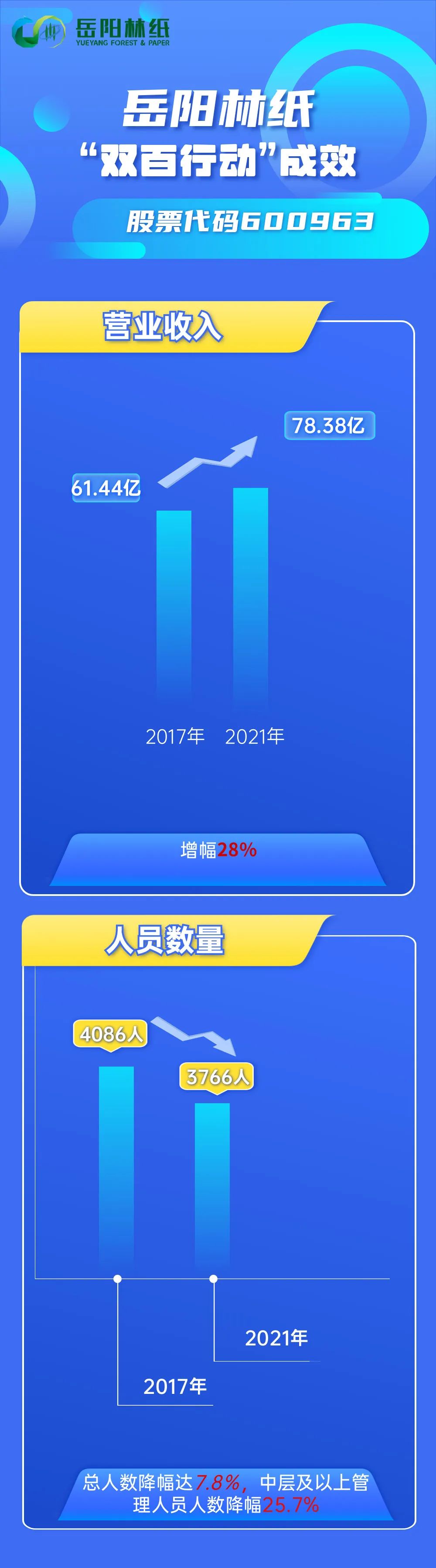 回顾岳阳林纸5年来国企改革“双百行动”历程,贯彻新发展理念,向创新要动力,向改革要活力,随着一条条举措相继出台,国有资本布局结构持续优化;一个个改革“堵点”打通、“痛点”破解,企业发展活力更加强劲;一次次探索付诸实践,企业核心竞争力和经营水平日益提升;一波波发展红利与员工分享,公司实现高速增长向高质量发展转变,全体员工获得感、幸福感不断增强。营业收入从2017年度的61.44亿元增至2021年度的78.38亿元,增幅28%;公司市值突破历史新高,公司价值逐步获得资本市场认可。年末在职员工总数从4086人下降到3766人,降幅达7.8%,中层及以上管理人员人数降幅25.7%,公司人均效率得到有效提升。
