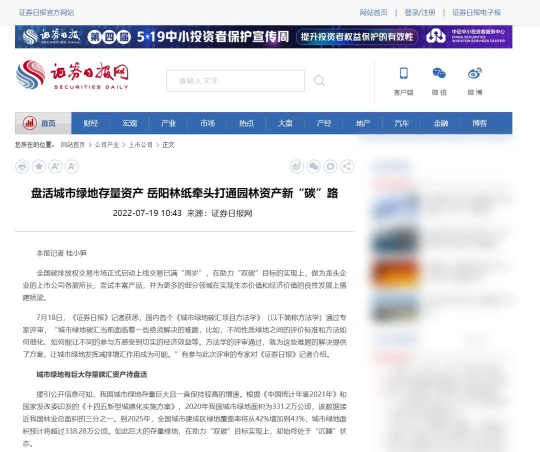证券日报在7月19日发布行业概念股综合稿《盘活城市绿地存量资产岳阳林纸牵头打通园林资产新“碳”路”》,文中评价,岳阳林纸作为龙头企业,展示特长和优势,尝试丰富产品,为更多的细分领域在实现生态价值和经济价值的良性发展上搭建桥梁。同时认为:“方法学为城市绿地碳汇当前面临着一些亟须解决的难题提供了方案。”