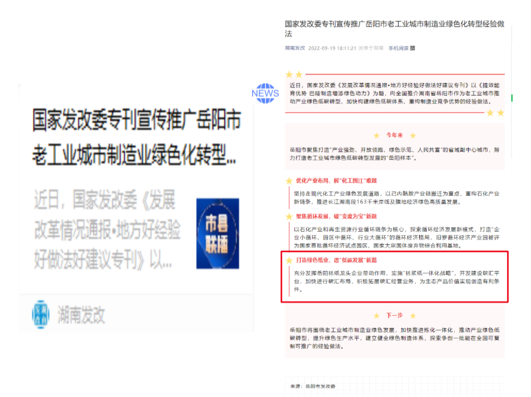 近日,国家发改委办公厅《发展改革情况通报?地方好经验好做法好建议专刊》以《提效能育优势巴陵制造增添绿色动力》为题,向全国推介岳阳市作为老工业城市推动产业绿色低碳转型、加快构建绿色低碳体系、重构制造业竞争优势经验,介绍岳阳林纸《打造绿色纸业??谱“低碳发展”新篇》优秀做法。