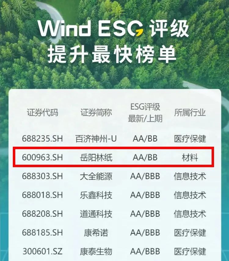 近期,万得信息技术股份有限公司(Wind)公布2022年度A股上市公司ESG评级榜单,岳阳林纸(600963.SH)名列Wind ESG评级提升最快榜单前列。