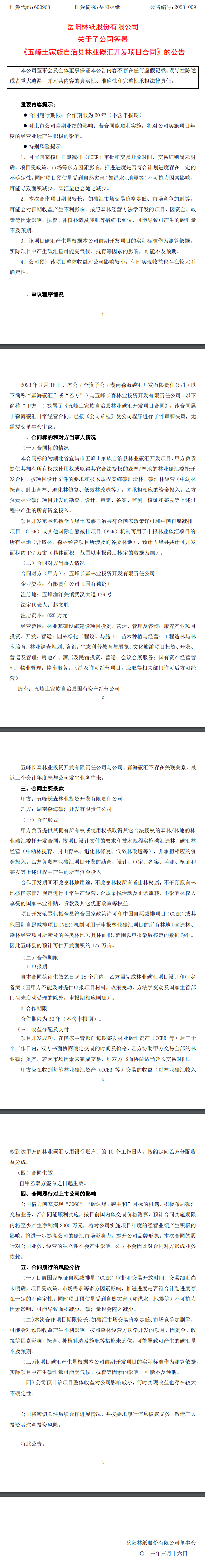 原标题:岳阳林纸股份有限公司关于子公司签署《五峰土家族自治县林业碳汇开发项目合同》的公告