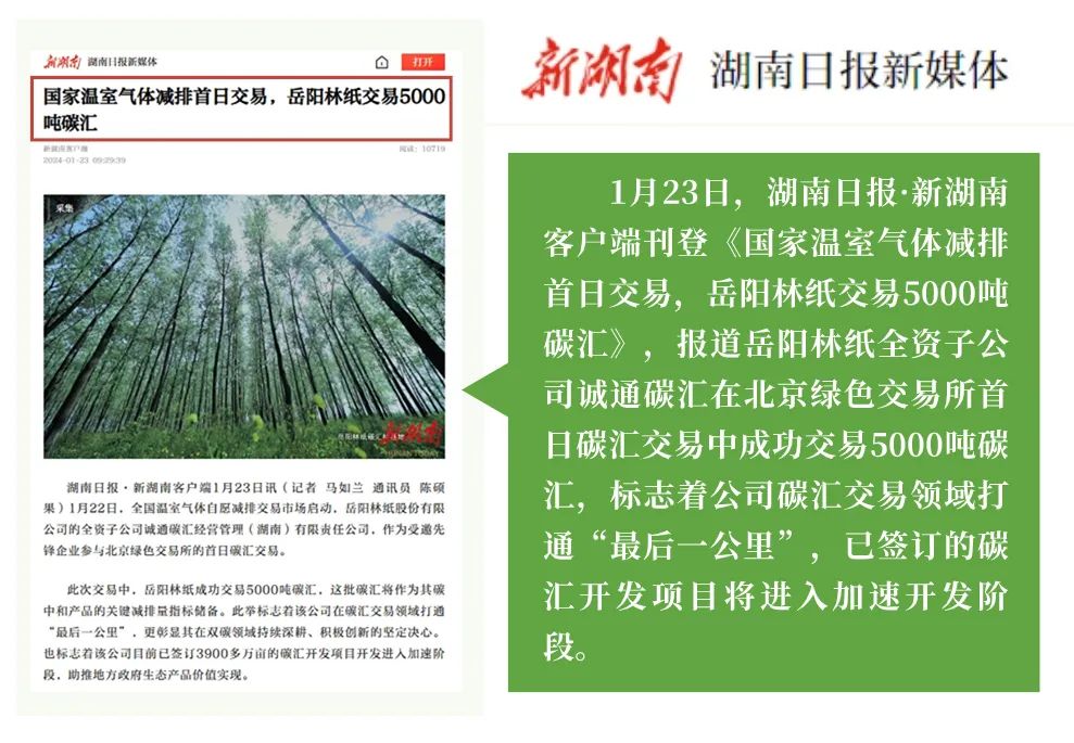 2024年2月19日,岳阳市人民政府办公室发布《关于2023年度全市国有“三资”运作改革工作优胜单位、优秀个人和市场化运作激励项目的表扬通报》,岳阳林纸“政府搭台+林农出资源+企业开发”的林业生态价值变现模式荣获优秀案例推介,并在全市范围内推广。