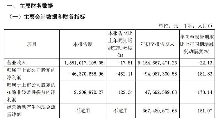 财报数据显示,今年前三季度公司营收约51.55亿元,同比减少22.13%;归属于上市公司股东的净利润亏损约9499万元。其中,第三季度营收15.81亿元,同比下滑17.81;归母净利润亏损0.46亿元,大幅下滑452.11%。
