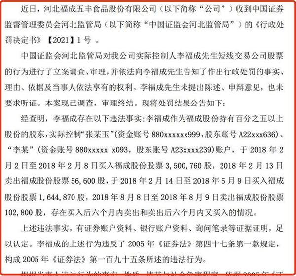 7月6日晚,福成股份发布公告称,近日,河北福成五丰食品股份有限公司收到中国证券监督管理委员会河北监管局的《行政处罚决定书》。经查明,李福成存在买入股票后六个月内卖出和卖出后六个月内又买入的违法事实。中国证监会河北监管局决定,对实际控制人李福成给予警告,并处以8万元罚款。