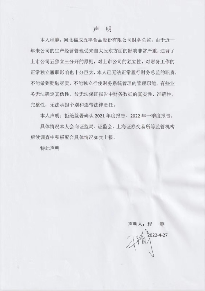 福成股份在问询函回复中称,4月27日晚上七点左右,公司董事会秘书发现桌上突然放置了一份有“程静”签名的纸质声明文件。文件中写道,“近一年来公司的生产经营管理受来自大股东方面的影响非常严重,违背了上市公司五独立三分开的原则。对上市公司的独立性,对财务工作的正常独立履职影响也十分巨大。本人已无法正常履行财务总监的职责,不能做到勤勉尽责,不能独立行使财务系统管理的管理职能,有些业务无法确定真伪性,故无法保证报告中财务数据的真实性、准确性、完整性,无法承担个别和连带法律责任。”
