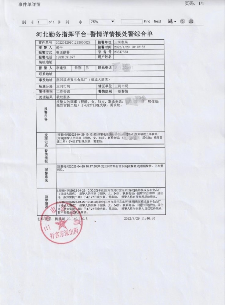 上市公司表示,为确认文件真实性,董秘通过多种方式联系程静,但一直联系不上本人。公司董事会会议当天,程静也未出席会议,并且一直处于失联状态,电话关机、微信语音及信息不应答、到访其家庭住址无回应。于是公司在2022年4月29日上午十点左右向河北省三河市公安局报警。