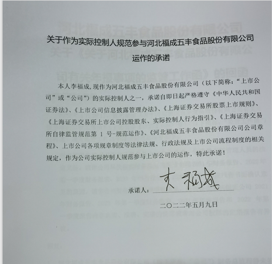 而对于公司实际控制人李福成未按公司治理和管理程序参与公司财务管理和其他经营活动一事,公告中提到,2022年4月21日,在福成股份肉制品分公司二楼会议室召开福成集团公司全体负责人、会计、出纳会议,一切付款必须通过福成集团财务部总经理批准,上市公司财务总监没有签字权,只负责合并报表,要求公司会计和出纳出具遵守规则保证书。