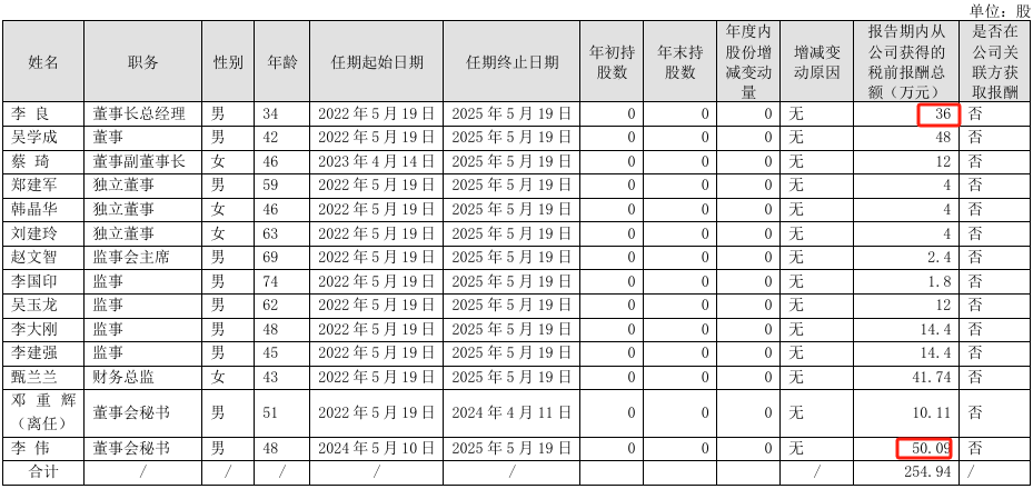 在管理层薪酬方面,报告显示,公司董事长兼总经理李良的年薪为36万元。而董事会秘书李伟,自2024年5月10日上任以来,年薪则达到了50.09万元。