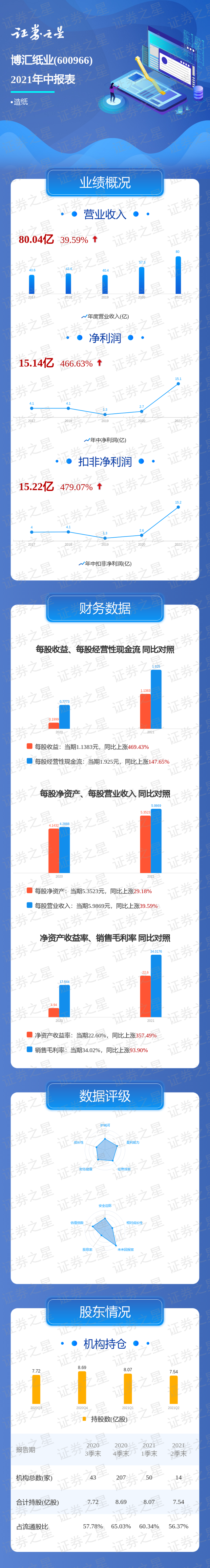 证券之星数据中心讯,博汇纸业2021中报显示,公司主营收入80.04亿元,同比上升39.59%;归母净利润15.14亿元,同比上升466.63%;扣非净利润15.22亿元,同比上升479.07%;负债率64.52%,投资收益783.82万元,财务费用1.49亿元,毛利率34.02%。