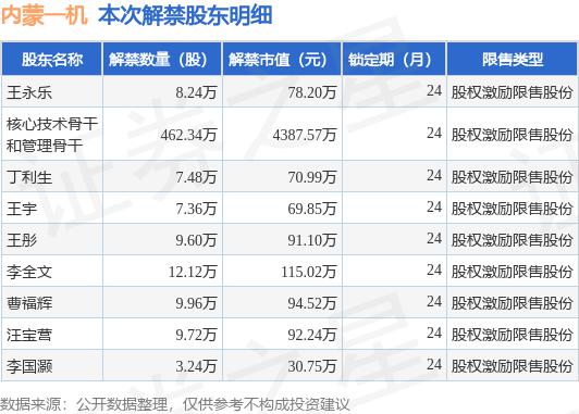 根据市场公开信息整理,内蒙一机(600967)于 6 月 9 日将有 530.06 万股限售股份解禁上市,为公司股权激励限售股份,占公司总股本 0.31%。本次解禁后,公司还有 884.69 万股限售股份,占总股本 0.52%。具体如下图所示: