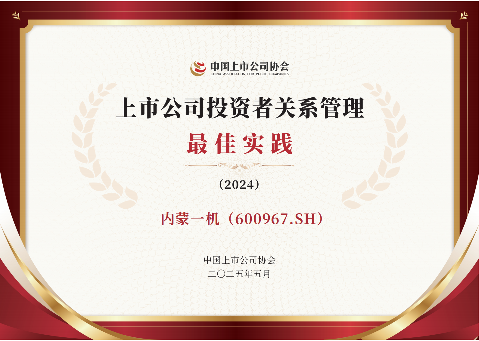 近日,中国上市公司协会正式发布“上市公司投资者关系管理最佳实践(2024)”评选结果,内蒙一机凭借在投资者关系管理方面的优异表现,连续两年获此殊荣。