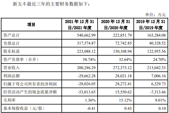 2021年,新五丰实现营业收入20.03亿元,归属于母公司所有者的净利润为-2.80亿元,经营活动产生的现金流量净额为-5.30亿元。