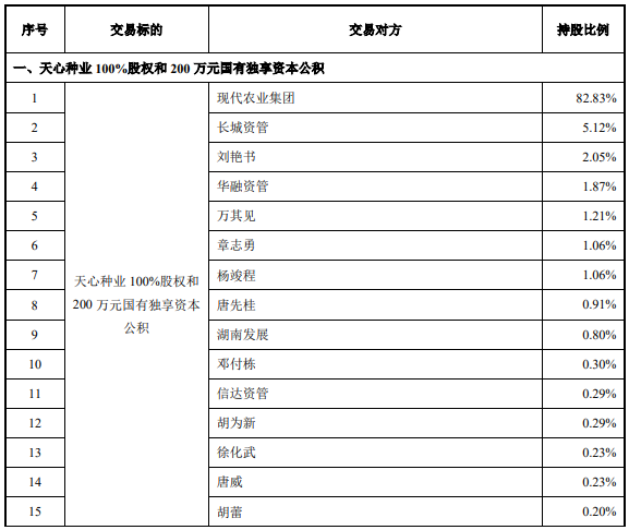 本次发行股份及支付现金购买的标的资产为湖南天心种业股份有限公司(以下简称“天心种业”)100%股权和200万元国有独享资本公积、沅江天心种业有限公司48.20%股权、衡东天心种业有限公司39.00%股权、荆州湘牧种业有限公司49.00%股权、临湘天心种业有限公司46.70%股权、湖南天翰牧业发展有限公司100%股权、郴州市下思田农业科技有限公司100%股权、新化县久阳农业开发有限公司100%股权、衡东鑫邦牧业发展有限公司100%股权、湖南天勤牧业发展有限公司100%股权、龙山天翰牧业发展有限公司100%股权。