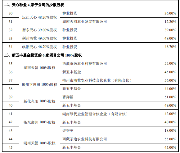 截至预案签署之日,新五丰控股股东为粮油集团,间接控股股东为现代农业集团,实际控制人为湖南省国资委。粮油集团持有新五丰25.63%的股份,现代农业集团直接持有新五丰10.94%的股权,同时持有粮油集团100%的股权,现代农业集团直接和间接持有新五丰36.57%的股权。湖南省国资委直接和间接持有新五丰间接控股股东现代农业集团100%股权,通过现代农业集团持有新五丰直接控股股东粮油集团100%的股权,且兴湘集团、建工集团均与现代农业集团有限公司签署了《表决权委托与一致行动协议》,前述特定对象系一致行动人,兴湘集团、建工集团均为新五丰的实际控制人湖南省国资委控制的公司。