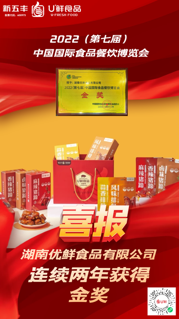 11月24日至26日,第七届中国国际食品餐饮博览会(以下简称“食餐会”)在长沙国际会展中心举办。U鲜食品在湖南农业发展投资集团有限责任公司的带领下作为参展商参展,并连续两年荣获食餐会金奖。