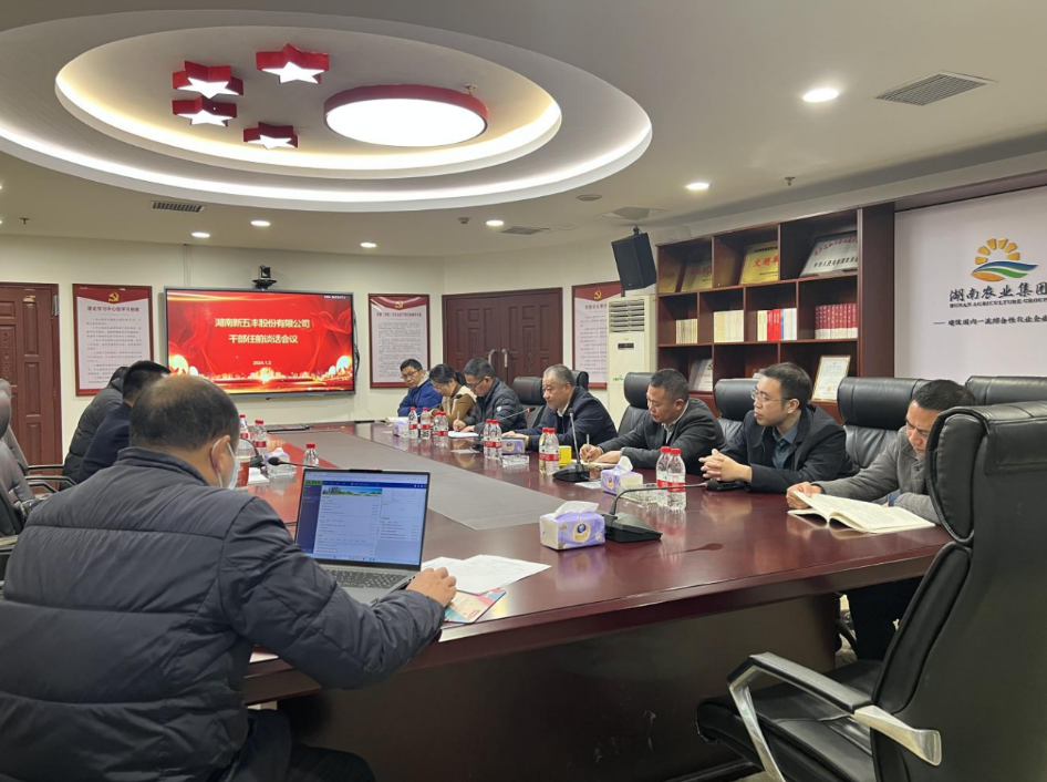 1月2日,湖南新五丰股份有限公司(以下简称“新五丰”)召开干部任前谈话会议。新五丰党委书记、董事长万其见,党委副书记、副董事长、总经理朱永胜,党委副书记、职工董事刘海生,纪委书记欧阳静出席会议。